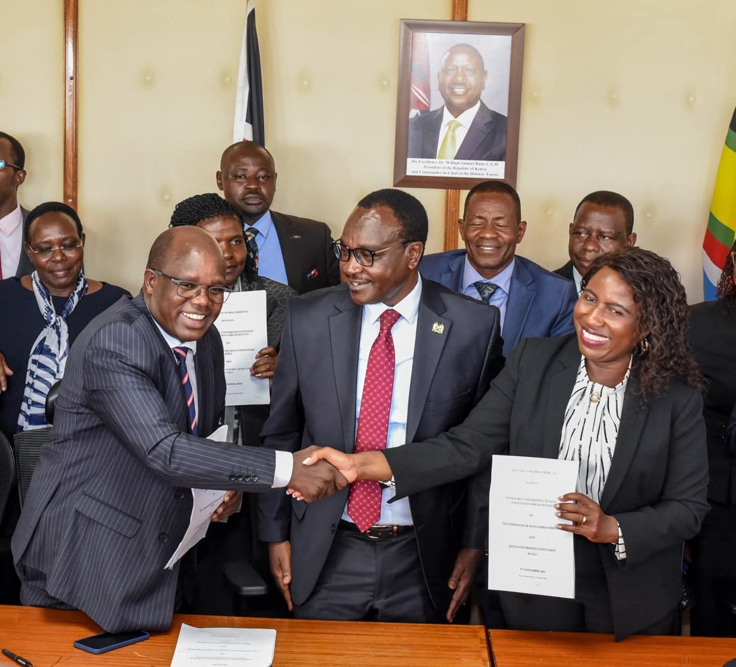 The signing of the Return-to-Work Formula was witnessed by the Principal Secretary for Higher Education, Dr. Beatrice Muganda Inyangala, and her Basic Education counterpart, Prof. Julius Bitok.
