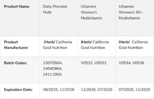 According to the agency in a statement posted on it’s official X handle, the affected products are marketed under the brand name CINCINNATI (WKRC) and include Daily Prenatal Multi, Ultamins Women’s Multivitamin, and Ultamins Women’s 50+ Multivitamin, all produced by iHerb/California Gold Nutrition.