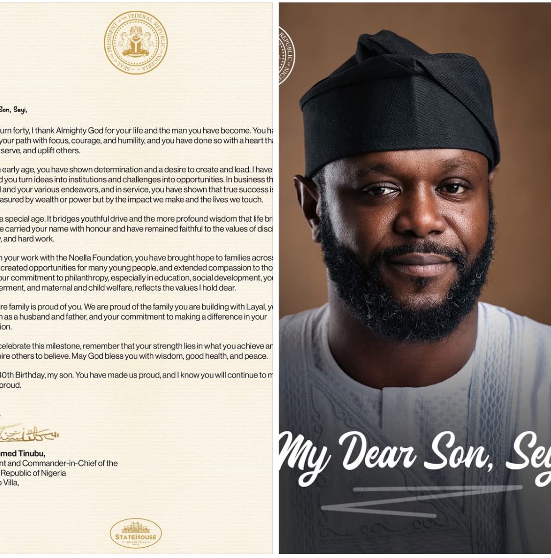 President Bola Ahmed Tinubu has penned an emotional letter to his son, Seyi Tinubu, as he marks his 40th birthday, expressing pride in the man he has become and commending his focus, courage, and humility.